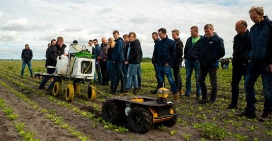 ![]() Smart Farming: Weed Elimination with 5G Autonomous Robots The project deploys a Robotti robot, a diesel-hydraulics autonomous tool carrier from Danish development company, Agrointelli . The robot was fitted with cameras, to capture images of the plants in the ground, and precision sprayers connected to a tank of herbicide. The image data captured by the camera is sent from the robot to an edge computing server via the 5G connection. Within the edge server, the data is processed through a machine learning algorithm using a complete classification model. In this model, the machine is “trained” to recognise potato plants and deploy a precision application of herbicide. |